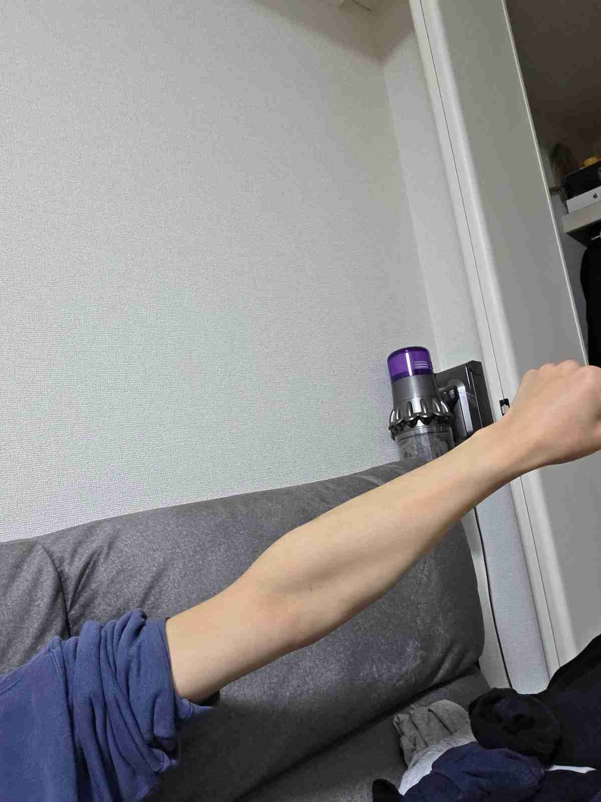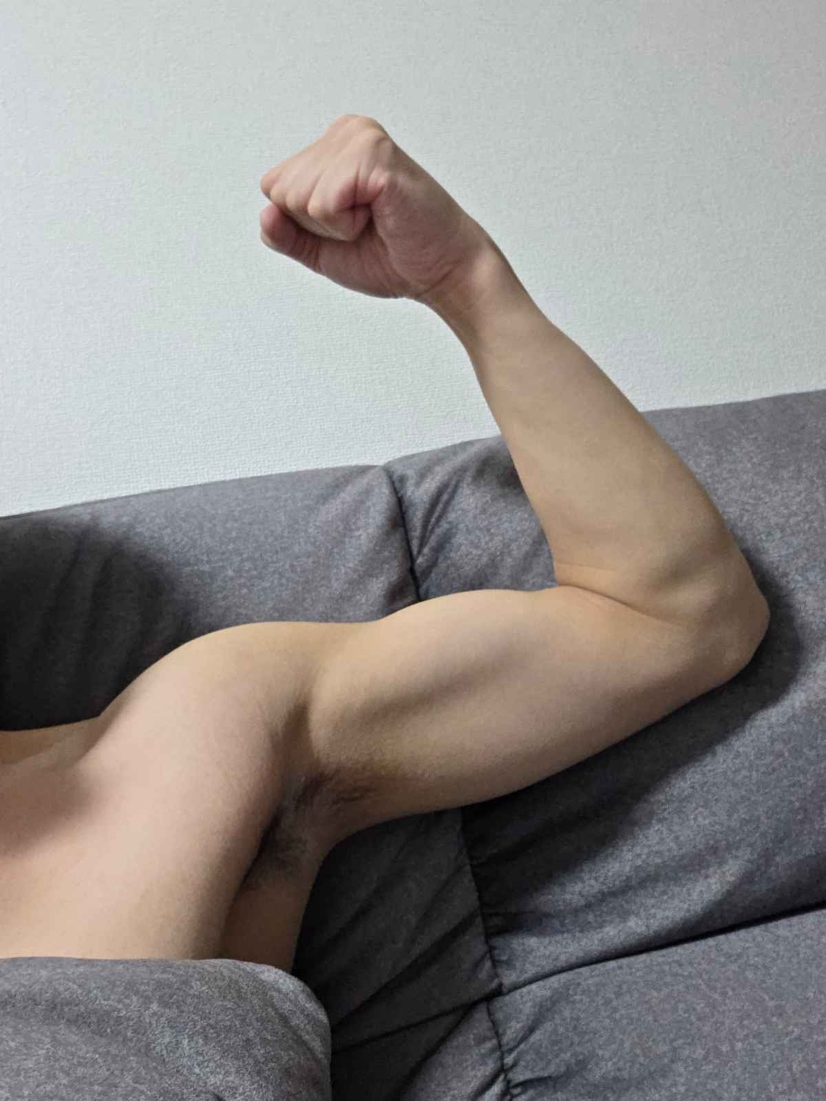 このレベルだったら気が向いたときにアームカールして1日プロテイン1杯飲むくらいでも倍太くなるやろ