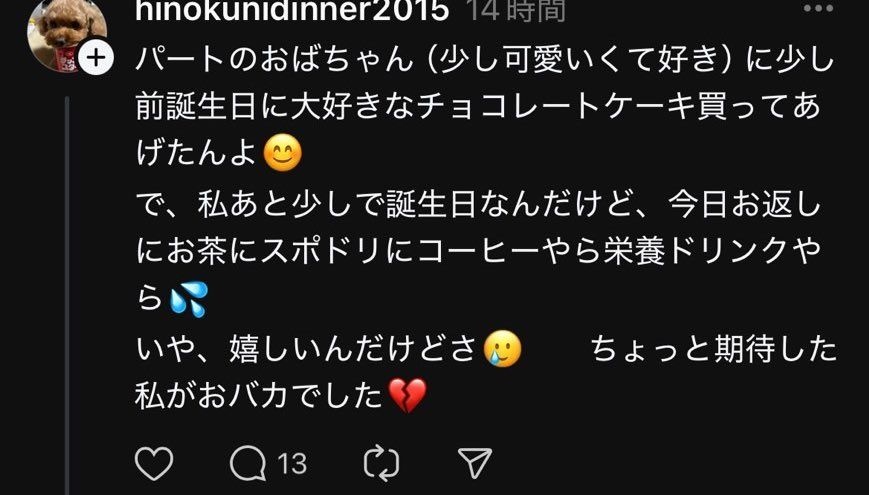 ケーキと言ったって個人に渡したんなら1ピース500円くらいだし等価交換じゃn