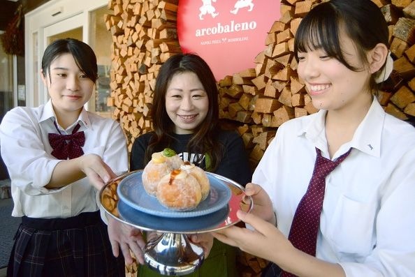 http://kyodoshi.com/article/24036ナシの生ドーナツを手に笑顔を見せる右から北澤愛さん、曽山絵里さん、白鳥萌愛さん