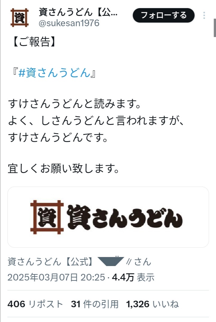 資さんうどん「『しさんうどん』とよく言われますが、違います。」公式声明