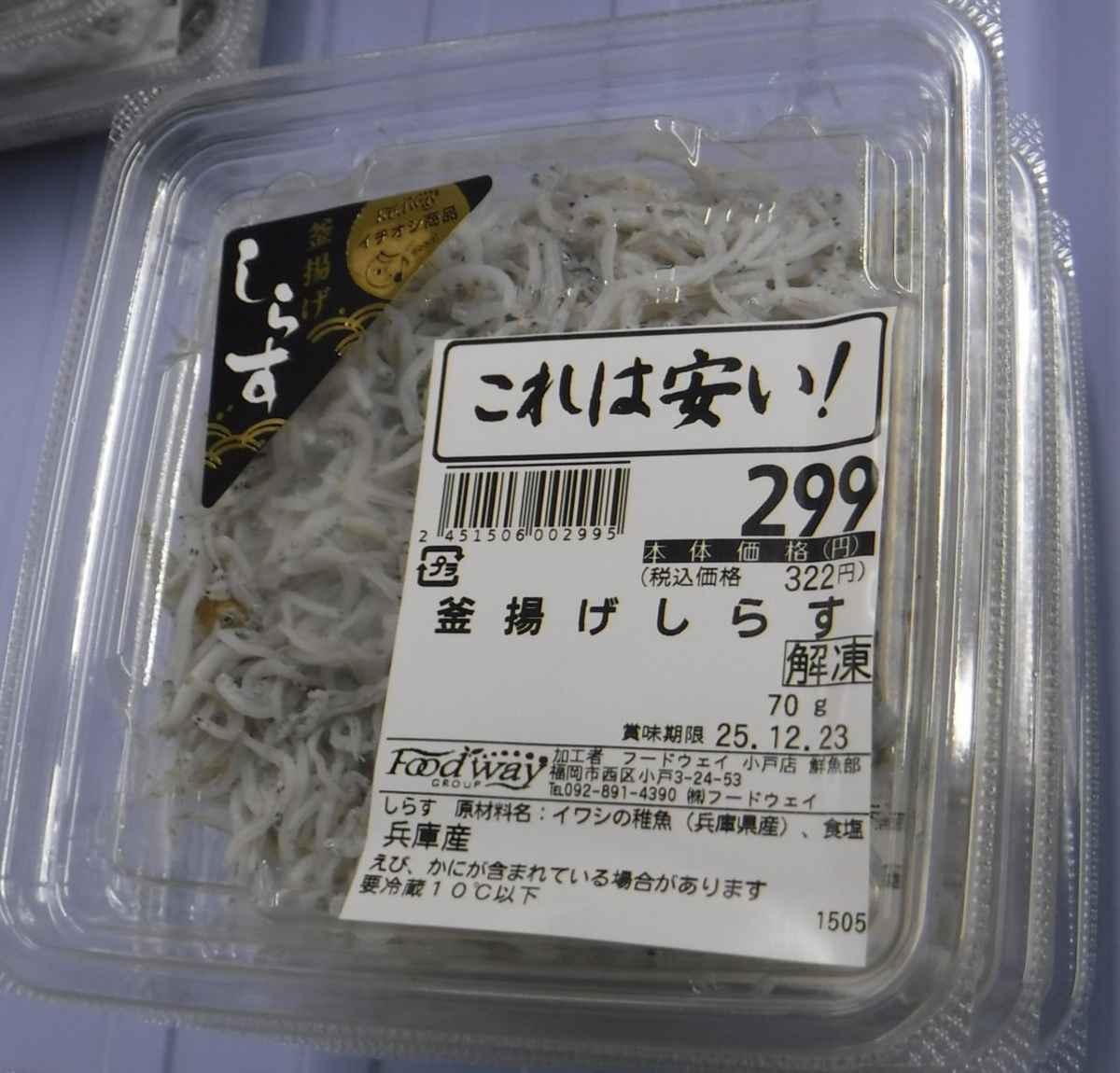 福岡市は18日、西区のスーパーで販売した「釜揚げしらす」にフグの稚魚1匹が混入していたと発表した。 購入者からの連絡で分かった。店は商品の自主回収を始めた。 対象は賞味期限が23日までの7