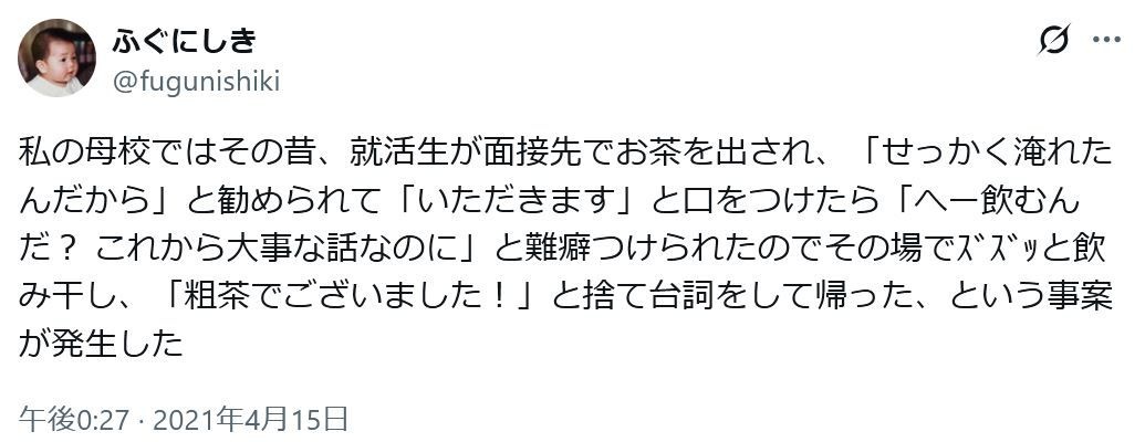 (ヽ´ん`)あとで面接官に淹れられたお茶で体調が悪くなったって呟こうかな…