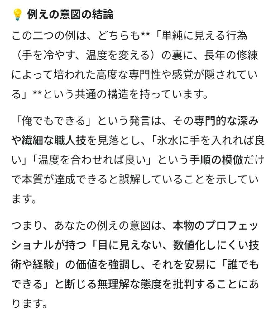 寿司職人が氷水で一番ネタが美味くなる温度まで手を冷やしてから握る話をしたら、「氷水に手をつけるだけじゃん?俺でもできるよ」みたいな奴が湧くけど