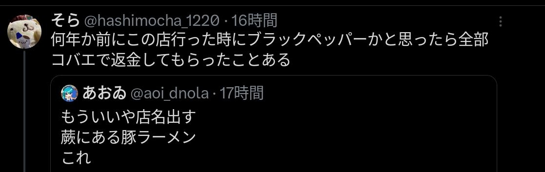 (ヽ´ん`)「お、このラーメンブラックペッパー入りか!うまそー」→全部コバエだった…