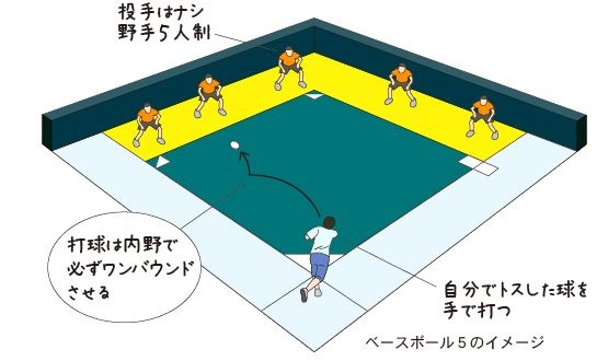 ベースボール5Baseball5ベースボール5とは2017年に世界野球ソフトボール連盟(WBSC)により発表された新たなアーバンスポーツで、5人制、5イニングからなる野球/ソフトボールの新しいストリート競技(簡易版)です。ベースボール5の特...