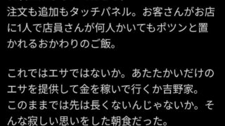 嫌儲 客「吉野家行ったらセルフに変わっていた。店員は無言で全てタッチパネル。吉野家はエサを提供してるのか。もう先がないだろう」