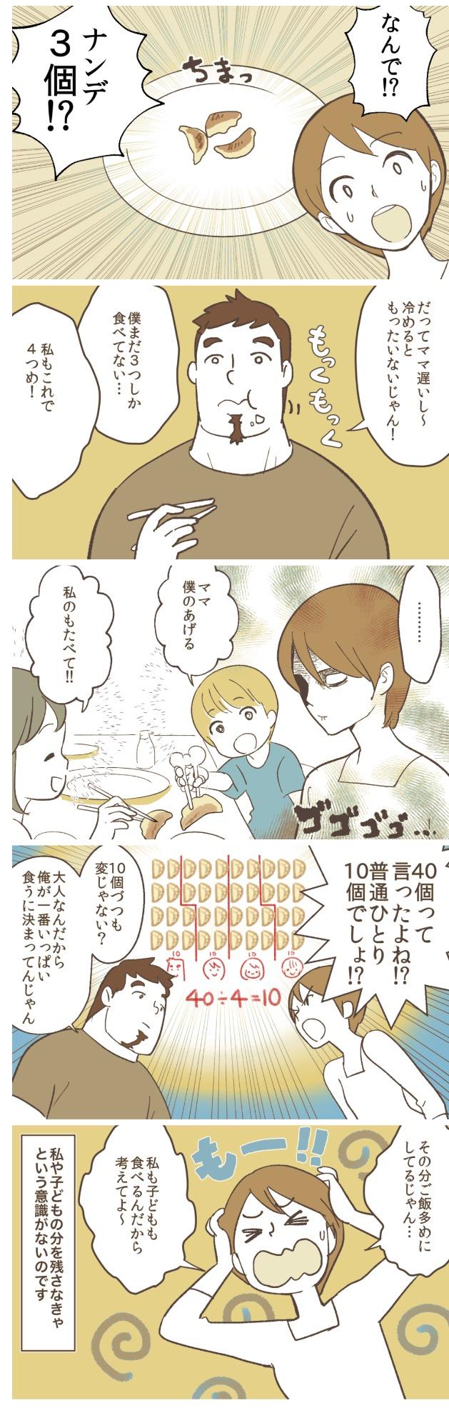 4人家族母「餃子たっぷり40個も焼いたよー」チビ「わぁーい👶」夫「30個食ったろ!w」