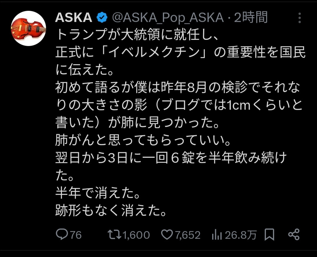 ASKA「昨年肺がんが見つかったがイベルメクチンを半年飲み続けたら治った☺」