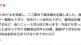 嫌儲 トランプ「ガソリン$1.98、食料品も安い、雇用バッチリ、関税で大儲け!インフレゼロ、FRBは金利を下げろ、今すぐニダ!