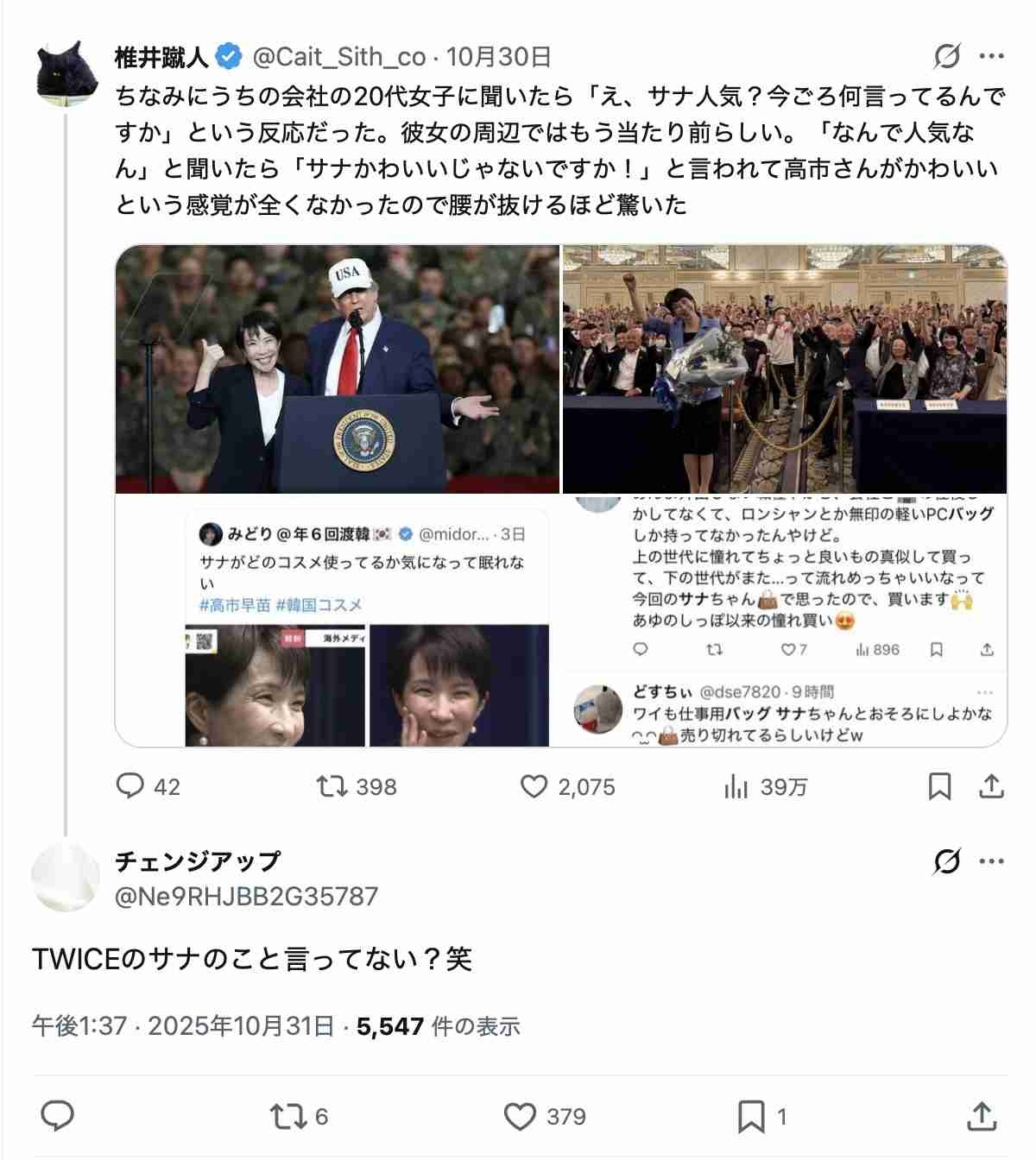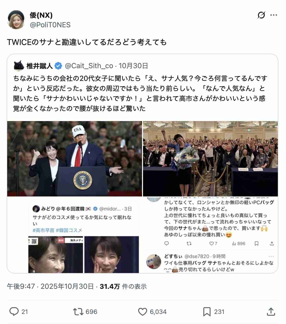 高市早苗が若い人に人気ってのも大半は初の女性首相っていうなんとなくなイメージなだけで