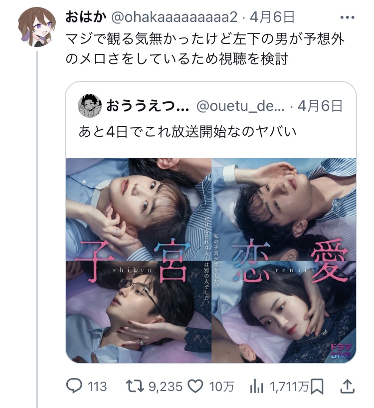 X女子「『子宮恋愛』ってドラマ見る気なかったけど好みのイケメン出るから観るわ」 10万いいね